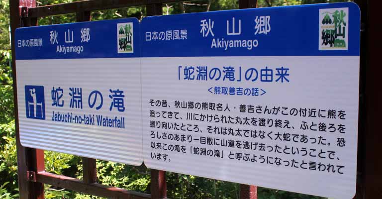 その昔、秋山郷の熊取名人・善吉さんがこの付近に熊を追ってきて、川にかけられた丸太を渡り終え、ふと後ろを振り向いたところ、それは丸太ではなく大蛇であった。恐ろしさのあまり一目散に山道を逃げ去ったということで、以来この滝を「蛇淵の滝」と呼ぶようになったと言われています。