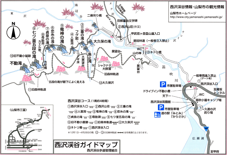 お車は、中央自動車道(一宮・御坂IC)から60分、関越自動車道(花園IC)から120分。 ペットは滝つぼや人(ハイカー)に危険。