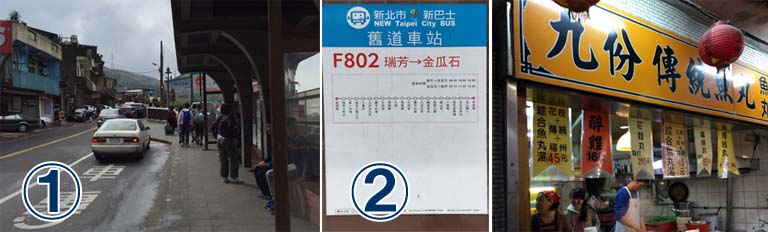 九分行きバス 料金は102元台北駅から地下鉄(MRT)で3駅。忠孝復興駅で下車し出口1から地上へ。①写真のとおりSOGOを右に見ながら出口1の反対方向に進みROLEXの看板が見える交差点を左に行くと九分行きのバス停(②写真)が有ります。1062の金瓜石行きバス(③写真)に乗ります。料金は102元で乗車時に支払います。おつりがもらえないので細かいお金が必要です。乗合タクシーや私設バスの客引きがいるのでご注意を。